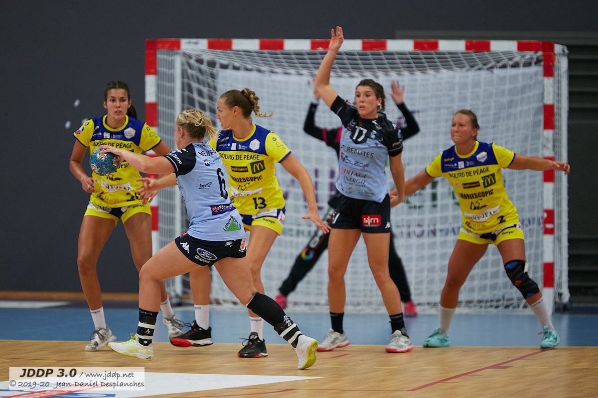 Retrouvez les photos du match (J05) de Ligue Féminine de Handball / Ligue Butagaz Energie (LFH) 2019-20 Bourg-de-Péage Drôme Handball versus Chambray Touraine Handball (CTHB), score final 27-26 du samedi 14-SEP-19 au Complexe Vercors.