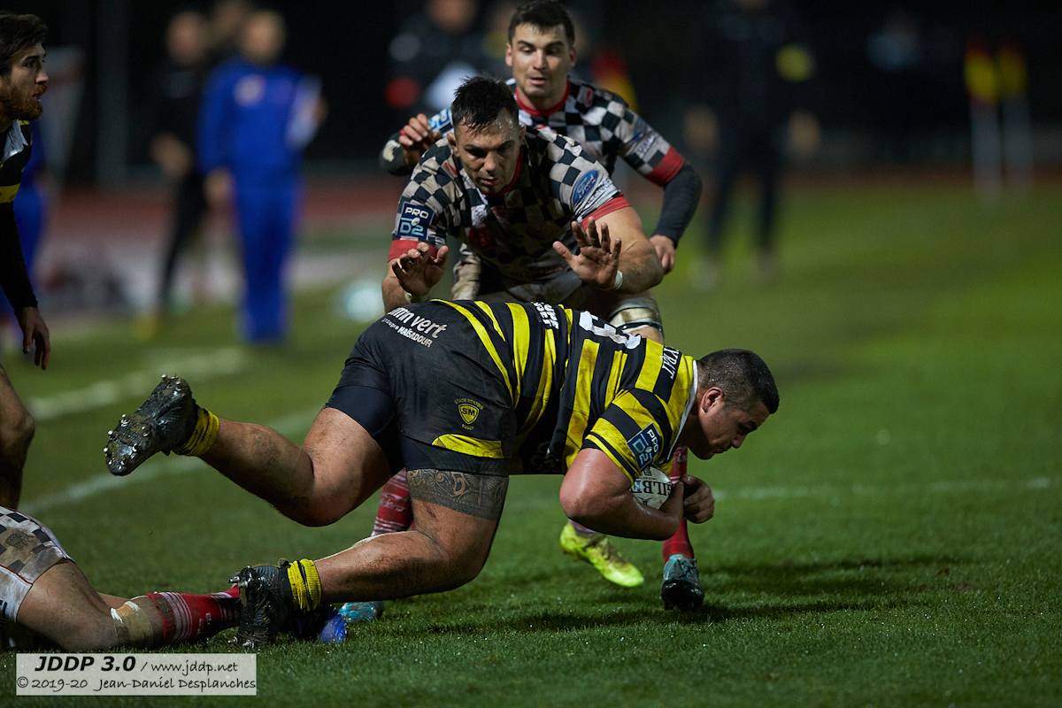 En photo, le Centre Opetera Peleseuma (#13) auteur du 1er essai des Damiers, félicité par l’Arrière Alexandre Vaffier (#15) …