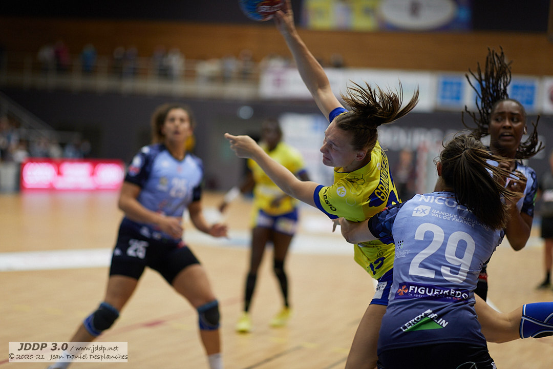 Retrouvez les photos du match de Ligue Féminine de Handball (LFH) / Ligue Butagaz Energie (LBE) 2020-21 – J3 / Bourg-de-Péage Drôme Handball versus Chambray Touraine Handball (CTHB), score final 20 – 30 du samedi 26-SEP-20 au Complexe Vercors.