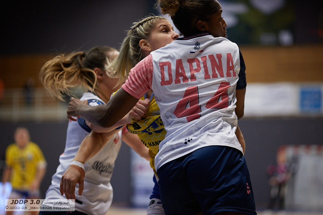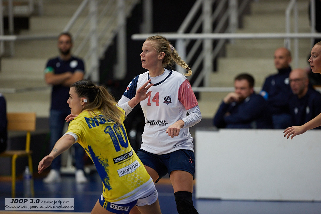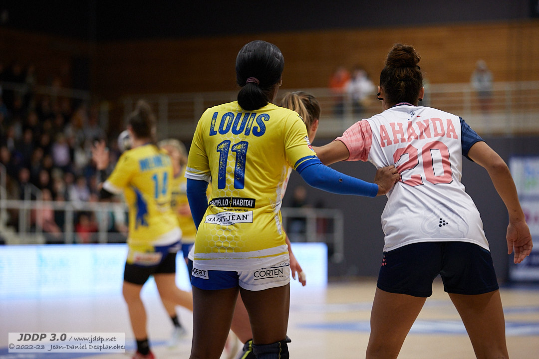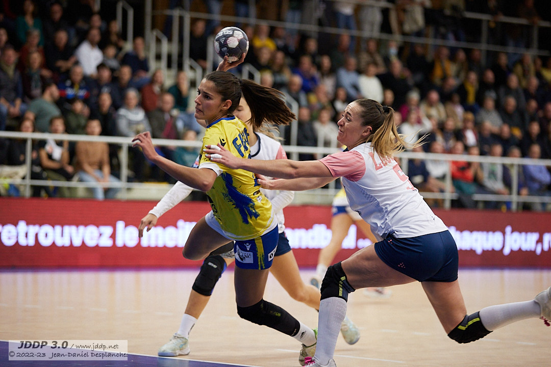 Photo ci-dessus, Lucie Modenel (#10) aux prises avec son ex-co-équipière Léna Grandveau (#29). Elle vient de signer au Chambray Touraine Handball (CTH) – info. JAN-23 -.